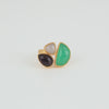 Crafted from 22K gold plated brass, this statement ring brings together artistry and elegance in a bold yet refined form. Set with three distinctive gemstones—white chalcedony, amethyst, and aqua chalcedony—each stone is cut in a unique shape, creating a modern, expressive composition that highlights their soft, harmonious hues.